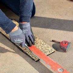 Als slechts een deel van het verharde oppervlak bedekt is met WARCO balspeelmatten, zal er een kleine opstap ontstaan aan de rand van het speeloppervlak. Om te vermijden dat deze zone een stoprand wordt, worden de open zijden van het speeloppervlak rondom afgeboord met de RM anti-trip wig. De anti-trip wig wordt gewoon op de onderlaag gelijmd.
