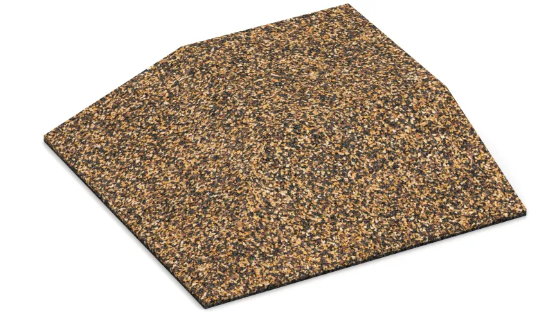 Het hoekpaneel met twee haaks op elkaar staande paneelzijden, gevormd in de vorm van een wig, is een nuttige en met het systeem verenigbare aanvulling op het rubbergranulaatpaneel van het type FS. Het hoekpaneel wordt gebruikt tussen 2 haaks op elkaar staande randpanelen FI om een hoek te vormen zonder struikelgevaar. Randpanelen en hoekpanelen worden gebruikt wanneer slechts een deel van het vloeroppervlak is bedekt met rubbergranulaattegels. Het hoekpaneel compenseert soepel het niveauverschil tussen het vloeroppervlak en het rubber paneeloppervlak en vermindert het risico op ongevallen.