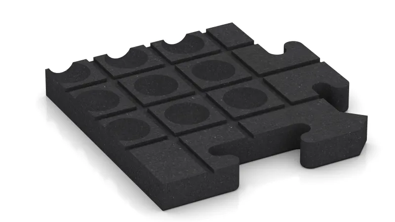 De tegels worden los op een vlakke ondergrond gelegd en sluiten stevig aan via de puzzelverbinding. Zo ontstaat een nette, gedefinieerde hoekafwerking zonder dat zagen op locatie nodig is. Rechte randen en subtiele facetten zorgen voor een egaal, professioneel vloerbeeld – geschikt voor zowel tijdelijke als permanente toepassingen.