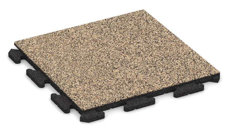 Het waterdoorlatende materiaal laat regen- en spoelwater snel weglopen; het oppervlak droogt vlot. Desinfectiemiddelen kunnen zonder bezwaar worden gebruikt, waardoor het onderhoud eenvoudig en hygiënisch is. De plaat blijft elastisch, duurzaam en temperatuurbestendig – ze rot of splintert niet en is blijvend vorstbestendig. De lichte schokdemping ontlast gewrichten en verhoogt het lig- en loopcomfort.