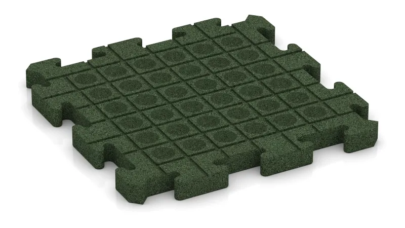 Twee zijden van de tegel zijn voorzien van een positief profiel, de andere twee van een bijpassend negatief profiel. Tijdens het leggen grijpen de tegels van onderen in elkaar en vormen zo een sterke mechanische koppeling. Van bovenaf ontstaat een egaal, strak oppervlak met een regelmatig voegpatroon – vergelijkbaar met een schaakbordmotief.