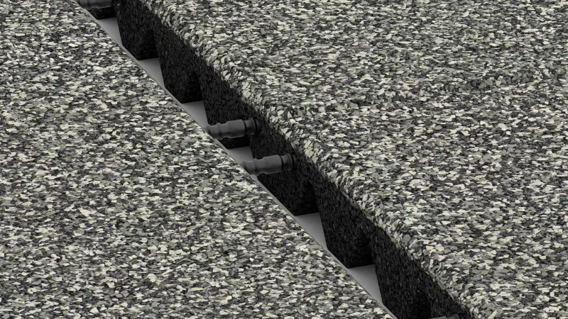 Voor buitentoepassingen adviseert WARCO een stabiele, drainerende onderbouw. Bewezen oplossingen zijn kunststof honingraatmatten (bijv. grindroosters) of een bestaande gebonden en waterdoorlatende onderlaag zoals drainbeton. Als de ondergrond niet doorlatend is, moet er bij open ligging een afschot van minimaal 1,5 % worden voorzien voor de afwatering. Leggen op losse materialen zoals zand, grind of split wordt afgeraden – deze kunnen verschuiven onder elastische tegels.