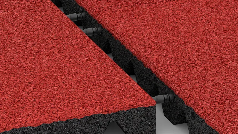 De openporige EPDM-toplaag is UV-bestendig, slijtvast en slipvast – ook op natte ondergrond. Dankzij het huidvriendelijke oppervlak is de tegel uitermate geschikt voor toepassingen met direct lichaamscontact. De onderzijde is gemaakt van ELT-granulaat met een patroon van omgekeerde piramidevormen, dat schokken dempt, regenwater afvoert en zorgt voor snelle droging – ideaal bij wisselende weersomstandigheden.