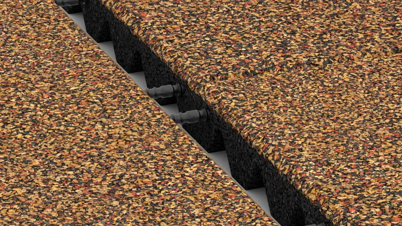 De openporige EPDM-toplaag is UV-bestendig, slijtvast en slipvast – ook op natte ondergrond. Dankzij het huidvriendelijke oppervlak is de tegel uitermate geschikt voor toepassingen met direct lichaamscontact. De onderzijde is gemaakt van ELT-granulaat met een patroon van omgekeerde piramidevormen, dat schokken dempt, regenwater afvoert en zorgt voor snelle droging – ideaal bij wisselende weersomstandigheden.