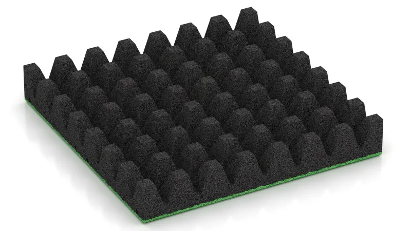 De tegel is opgebouwd uit twee lagen: een bijna 7,5 cm dikke functionele onderlaag van gerecycled ELT-rubbergranulaat (afkomstig van autobanden) en een slijtvaste EPDM-toplaag. Het poreuze EPDM-oppervlak is slipvast, UV-bestendig, slijtvast en huidvriendelijk. De onderzijde is voorzien van omgekeerde piramidevormen die de impactenergie verspreiden en als drainagelaag functioneren. Hierdoor wordt water snel afgevoerd en plasvorming vermeden.