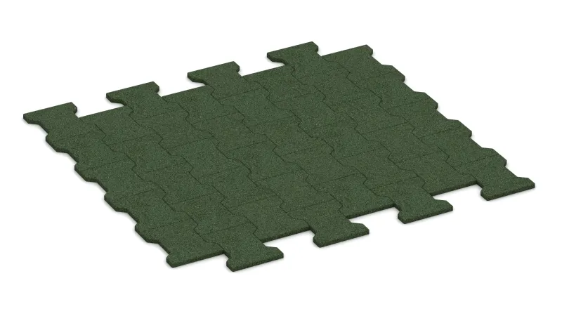 De matten zijn gemaakt van PU-gebonden ELT-rubbergranulaat en zijn volledig waterdoorlatend. De randen zijn licht afgeschuind en de onderzijde is voorzien van ingeperste drainagerillen, die het doorgedrongen water afvoeren en ervoor zorgen dat het oppervlak onder vrijwel alle weersomstandigheden vrij van plassen blijft.