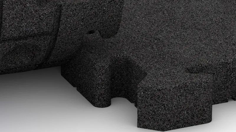 De tegels zijn rondom voorzien van een doorlopende puzzelverbinding over de volledige hoogte. Zo ontstaat een stevige, stabiele koppeling die de tegels in het vlak goed bij elkaar houdt. Omdat het profiel symmetrisch is, kan elke zijde aan elke andere zijde worden gekoppeld. Dat maakt de plaatsing eenvoudig en zorgt voor een gelijkmatig voegpatroon. De tegels kunnen ook weer worden verwijderd en hergebruikt, zonder schade.