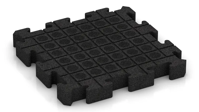 De tegels zijn rondom voorzien van een doorlopende puzzelverbinding over de volledige hoogte. Zo ontstaat een stevige, stabiele koppeling die de tegels in het vlak goed bij elkaar houdt. Omdat het profiel symmetrisch is, kan elke zijde aan elke andere zijde worden gekoppeld. Dat maakt de plaatsing eenvoudig en zorgt voor een gelijkmatig voegpatroon. De tegels kunnen ook weer worden verwijderd en hergebruikt, zonder schade.