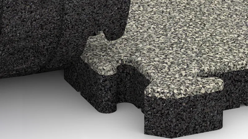 De tegels zijn rondom voorzien van een doorlopende puzzelverbinding over de volledige hoogte. Zo ontstaat een stevige, stabiele koppeling die de tegels in het vlak goed bij elkaar houdt. Omdat het profiel symmetrisch is, kan elke zijde aan elke andere zijde worden gekoppeld. Dat maakt de plaatsing eenvoudig en zorgt voor een gelijkmatig voegpatroon. De tegels kunnen ook weer worden verwijderd en hergebruikt, zonder schade.