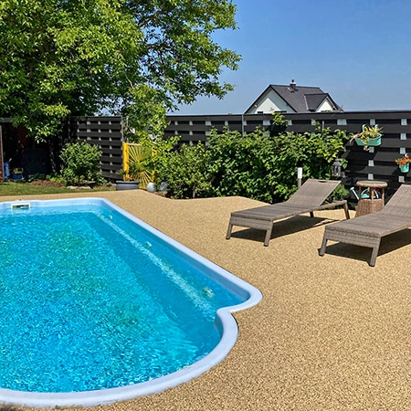 Je kunt het gebied rond een zwembad op veel verschillende manieren inrichten. Vaak worden tegels, natuurstenen platen, houten planken of WPC gebruikt. Vaak ziet de vloer er dan in het begin mooi uit, maar verweert hij snel en is hij problematisch bij dagelijks gebruik bij het zwembad.